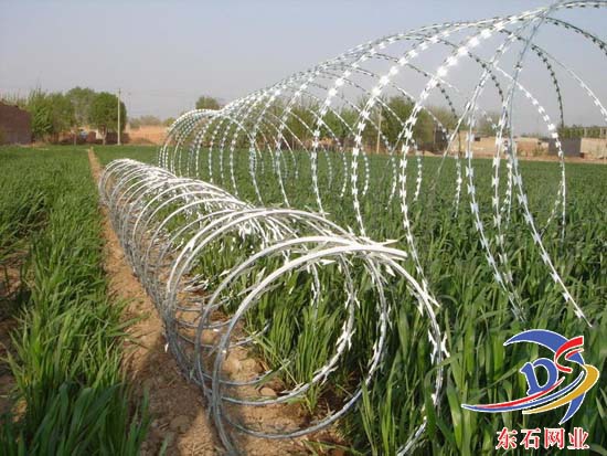 刀片刺網(wǎng)又名蛇腹網(wǎng)或刮刀型刺網(wǎng),是一種近年來防護(hù)、隔離能力較強(qiáng)的新型產(chǎn)品。 刀片用及耐腐蝕性的熱鍍鋅鋼板或不銹鋼板做材料,由專用機(jī)械強(qiáng)力包附與熱鍍鋅高碳鋼絲或不銹鋼絲做的芯線上。由于有著鋒利美觀的刀片刺、高強(qiáng)度的芯線,使本產(chǎn)品綜合了防阻效果好、難破壞、安裝美觀方便快捷、耐老化等諸多優(yōu)點。